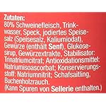 Zutaten: 80% Schweinefleisch, Trinkwasser, Speck, jodiertes Speisesalz (Speisesalz, Kaliumiodat), Gewürze (enthält SENF), Glukosesirup, Gewürzextrakte, Stabilisator: Trinatriumcitrat; Antioxidationsmittel: Natriumisoascorbat; Konservierungsstoff: Natriumnitrit; Schafsaitling, Buchenholzrauch. (Kann Spuren von SELLERIE enthalten)