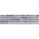 Zutaten: HERINGSFILETS (Clupea harengus) (60%), Wasser, SENF (12,4%) (Wasser, Branntweinessig, SENFSAATEN, Speisesalz, Zucker, Gewürze), Rapsöl, HÜHNEREIGELB (2,4%), Zucker, Branntweinessig, WEIZENSTÄRKE, Speisesalz, Gewürze, Verdickungsmittel Johannisbrotkernmehl.