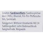 Zutaten: SARDINENFILETS (Sardina pilchardus) (76%), Olivenöl, Piri-Piri-Pfefferschoten, Speisesalz.