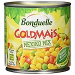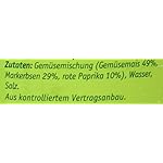 Zutaten:Gemüsemischung: Gemüsemais (55%), Markerbsen (32%), rote Paprika (13%) Wasser, Salz, ohne zugesetzte Aromen.
