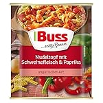 Zutaten: 34% gegarte Nudeln (Wasser, Hartweizengrieß, Hühnereiweiß), 20% Schweinefleisch gewürzt (Schweinefleisch, Salz), Wasser, Zwiebeln, Tomatenmark, 5% Paprika, Zucker, Branntweinessig, Bauchspeck (Schweinebauch, Salz, Rauch), Gewürze (enthalten Sellerie, Senf), Salz, modifizierte Stärke, Weizenmehl, Rapsöl, Hühnereiweiß, Emulgator Mono- und Diglyceride von Speisefettsäuren, Verdickungsmittel Guarkernmehl, Magermilchpulver, Dextrose. Das Produkt kann Spuren von Soja enthalten!
