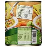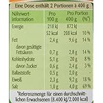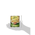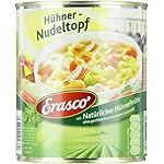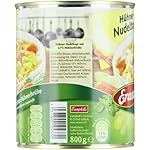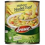 Zutaten: Wasser, 19% gekochte Muschelnudeln (HARTWEIZENGRIEß (GLUTEN),EIKLAR), 5,0% Gemüse (Möhren, Porree), 4,7 % gegartes Hühnerfleisch (Hühnerfleisch, Salz), Hühnerfett, Salz, Aroma (enthält EI und SELLERIE), Petersilie, Dextrose, färbender Möhrenextrakt, Verdickungsmittel: Guarkernmehl. Kann Spuren von Milch, Soja und Senf enthalten.