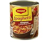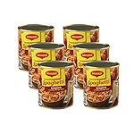 Maggi Spaghetti Bolognese – Schneller und praktischer Nudel Klassiker für Pasta-Fans Maggi Spaghetti Bolognese bringt das beliebte italienische Nudelgericht und seine leckere Pasta in fleischhaltiger Tomatensauce bequem und ohne viel Aufwand auf den Tisch. Dank der schnellen und unkomplizierten Zubereitung, kann man die leckeren Spaghetti in herzhafter Bolognese Fleischsauce mit würzigen Fleisch- und Karottenstückchen schon nach wenigen Minuten einfach und praktisch genießen. Mit einer Dose Maggi Spaghetti Bolognese bereitet man schnell und einfach eine leckere Mahlzeit für zwei Personen zu. Der Klassiker unter den Hackfleischsaucen-Rezepten ist ideal, um sich eine kleine Auszeit vom Alltag zu gönnen. Ob einfach gemütlich vor dem Fernseher oder für ein spontanes Abendessen zu zweit. Spaghetti Bolognese mit herzhafter und würziger Tomatensauce – ein Nudelgericht, das neben Spaghetti Carbonara, Ravioli und Penne Arrabiata immer passt! Der praktische 6er Pack garantiert dabei immer einen ausreichenden Vorrat, ob für zuhause oder für eine kleine Reise mit der Familie Zubereitung: Spaghetti in einen Topf geben und bei geringer Wärmezufuhr heiß werden lassen. Zubereitung in der Mikrowelle: 1. Spaghetti in ein mikrowellengeeignetes Serviergeschirr geben und zudecken. 2. Ca. 4 Min. bei 600 Watt erwärmen. 3. Einmal umrühren und weitere 4. Min. bei 600 Watt erwärmen
