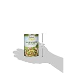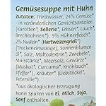 Trinkwasser, 24 % Gemüse (Karotten, Sellerie, Erbsen, Lauch, Brechbohnen-saisonal in veränderlichen Gewichtsanteilen), 9 % Hühnerfleisch, 2 % Nudeln (Hartweizengrieß) (Trockeneinwaage), Sonnenblumenöl, Steinsalz, Maltodextrin, Zwiebeln, Maisstärke, Meersalz, Gewürze* (Muskat, Curcuma, Pfeffer), Kräuter (Petersilie Liebstöckel), Knoblauch, Sellerie, Gluten, Gemüse / Hülsenfrüchte, Huhn, Umbelliferae, Weizen
